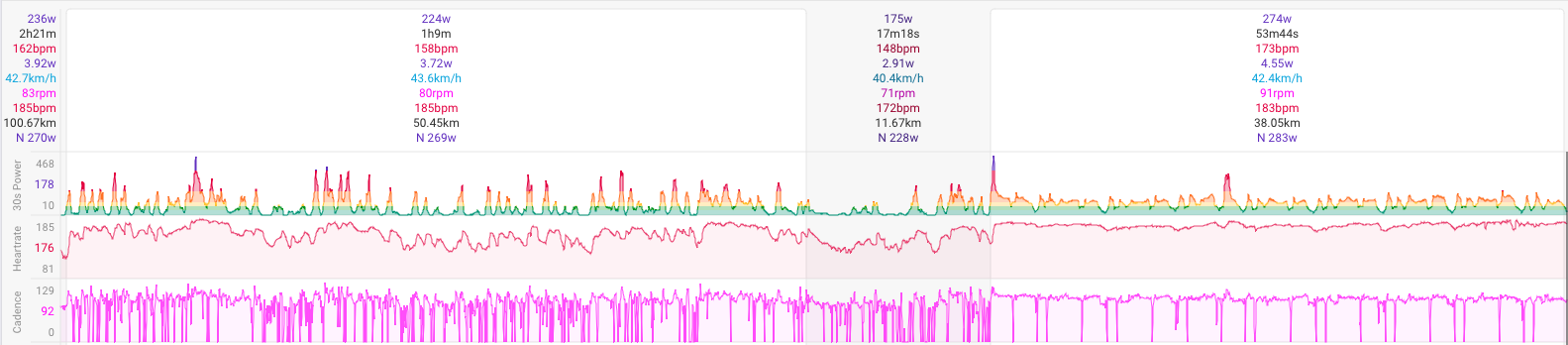 À seulement 274w moyen (4,55w/kg), j'arrive à rouler plus vite que le peloton et m'échapper seul.
